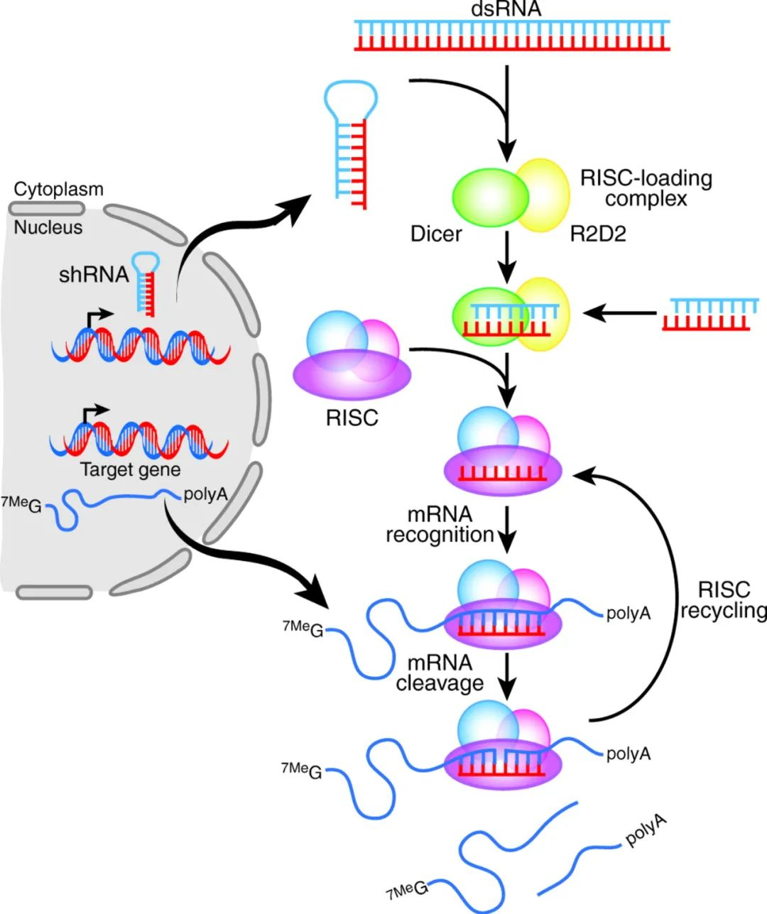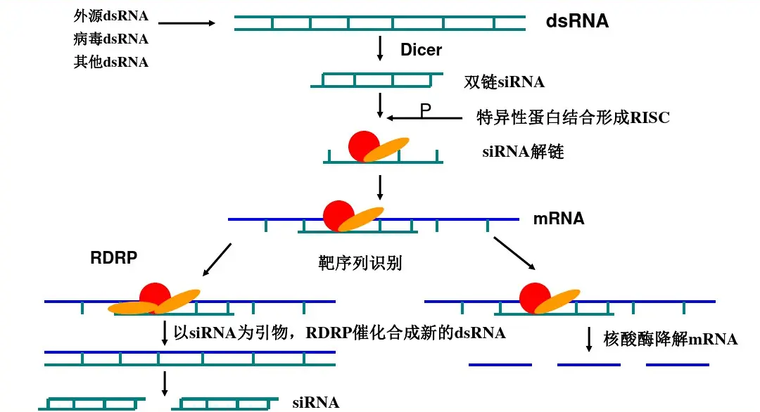 小干扰RNA(small interfering RNA,siRNA)一般是20-25bp的双链短RNA链,它一般是通过化学直接合成或者通过其它dsRNA在细胞内由Dicer酶剪切而成。在细胞内,siRNA可以与RISC复合体结合, 解开其双链,使双链RNA变为单链RNA。打开的单链RNA能够和mRNA上的互补序列结合,然后RISC复合体会切断与其互补的mRNA序列。完成这一系列操作后,RISC-siRNA复合体带着单链的siRNA,会从切断的mRNA上解脱,再去结合、继续降解靶基因mRNA(图2)。