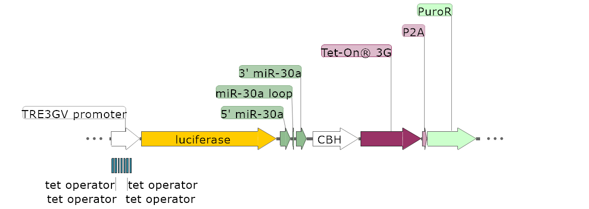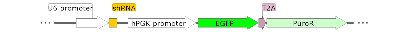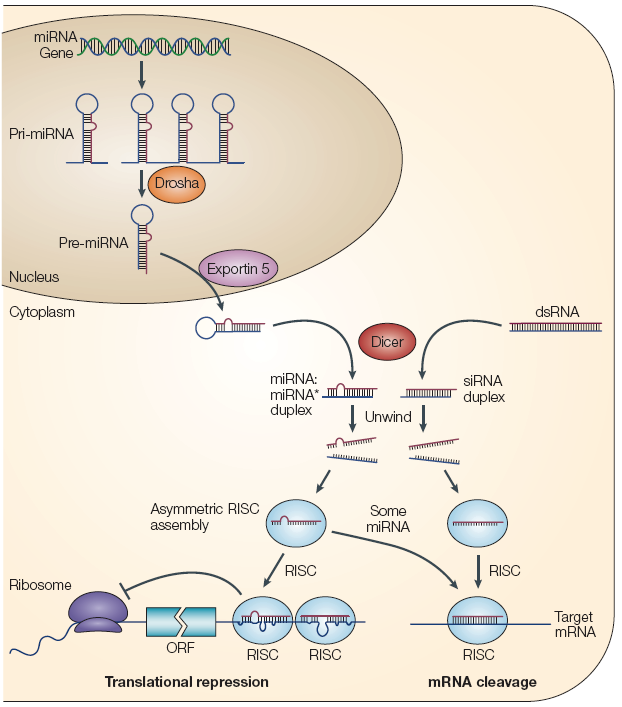 利用miRNA产生原理,同样可以实现siRNA的敲低,而且由于miRNA是由RNA聚合酶II(polII)启动转录的,所以可以使用特异性启动子,实现细胞的特异性敲降。在细胞核内,基因组DNA 转录生成较长的RNA分子(可长达1000nt),被双链RNA 特异的核糖核酸酶 Drosha 切割成长度大约70-100 碱基的、具发夹结构的RNA 分子(前体 microRNA)。这些发夹结构的RNA 通过核输出蛋白exportin5 机制转运到细胞质,然后被第二个双链 RNA 特异的核糖核酸酶Dicer 切割,得到19-23nt 大小的成熟的microRNAss 产物。成熟的单链microRNAss 与类似RNA 诱导沉默复合物(RISC)结合,并参与 RNA 干扰反应(RNAi)(图4)。